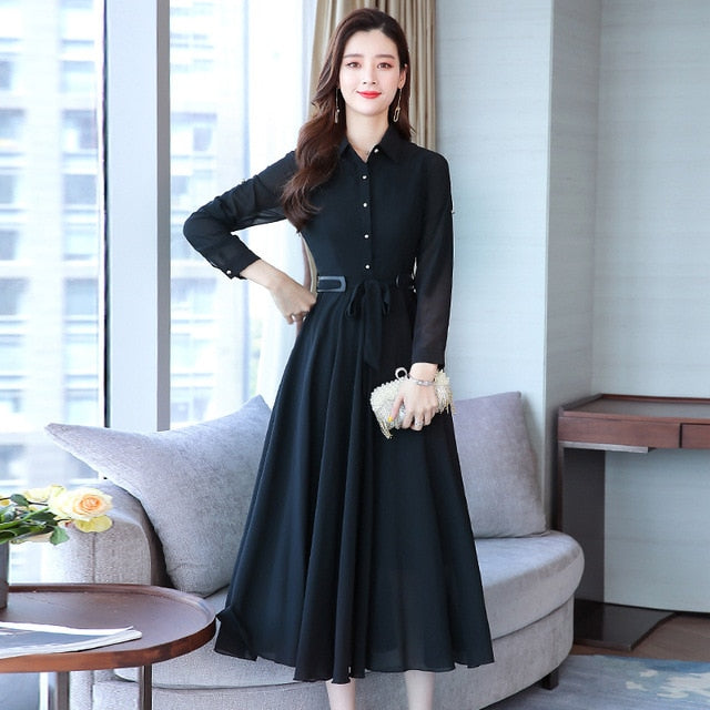 Spring And Autumn New Style Korean-style Slim Fit Slimming Mid-length Women's Dress Long Sleeve Chiffon Dress